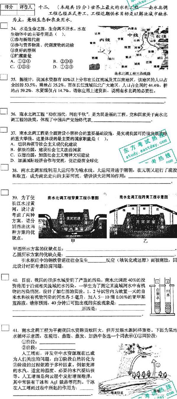 水電知識網»資訊»水利要聞»2003年高考:“南水北調”大題進上海綜合試卷 理工類占19分 文科類占18分