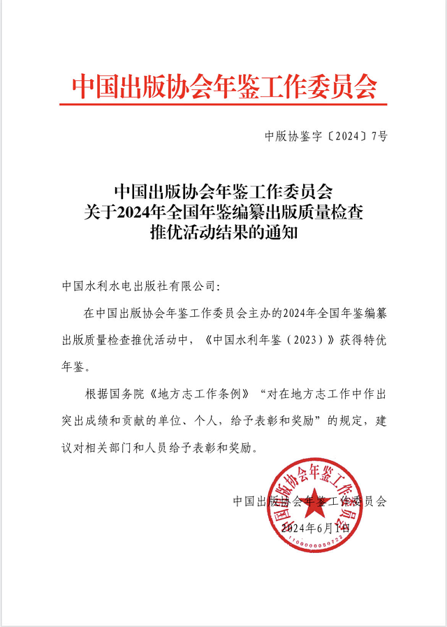近日, 中國出版協會年鑒工作委員會發布了《2024 年全國年鑒編纂出版質量檢查推優活動結果公布的通知》(中版協鑒字〔2024〕7號文)。由我社編輯出版的《中國水利年鑒2023》被評為“特優年鑒”,《中國南水北調年鑒2022》《中國河湖年鑒2022》獲評“優秀年鑒”。
