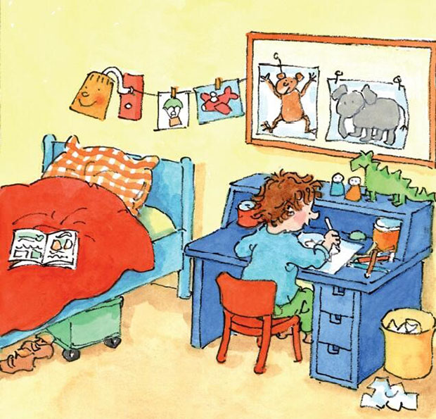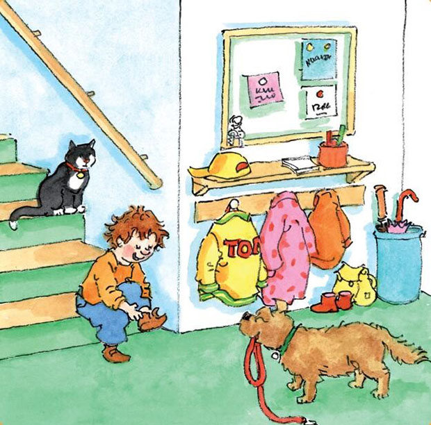 與繪圖同樣重要的當然是生動的故事情節(jié)和語言。好的英語啟蒙繪本,故事情節(jié)一定有趣又貼近生活,語言一定簡潔又地道。在此我推薦中國水利水電出版社的《Tom一家人》。《Tom一家人》作為英語啟蒙書從荷蘭引進時,該套書已經(jīng)在荷蘭暢銷多時,可以說是荷蘭第一暢銷童書也不為過。因為它的內容非常貼近孩子的生活。一套書中包括《我的家庭》《我的學校》《我的生日》《我的房子》,Tom所過的生活和中國小朋友的十分相似又略有不同,會讓小朋友感覺親切又有趣,全套書以英國小男孩Tom為第一人稱,感覺就像在讀小Tom的日記,語言簡單又活潑。